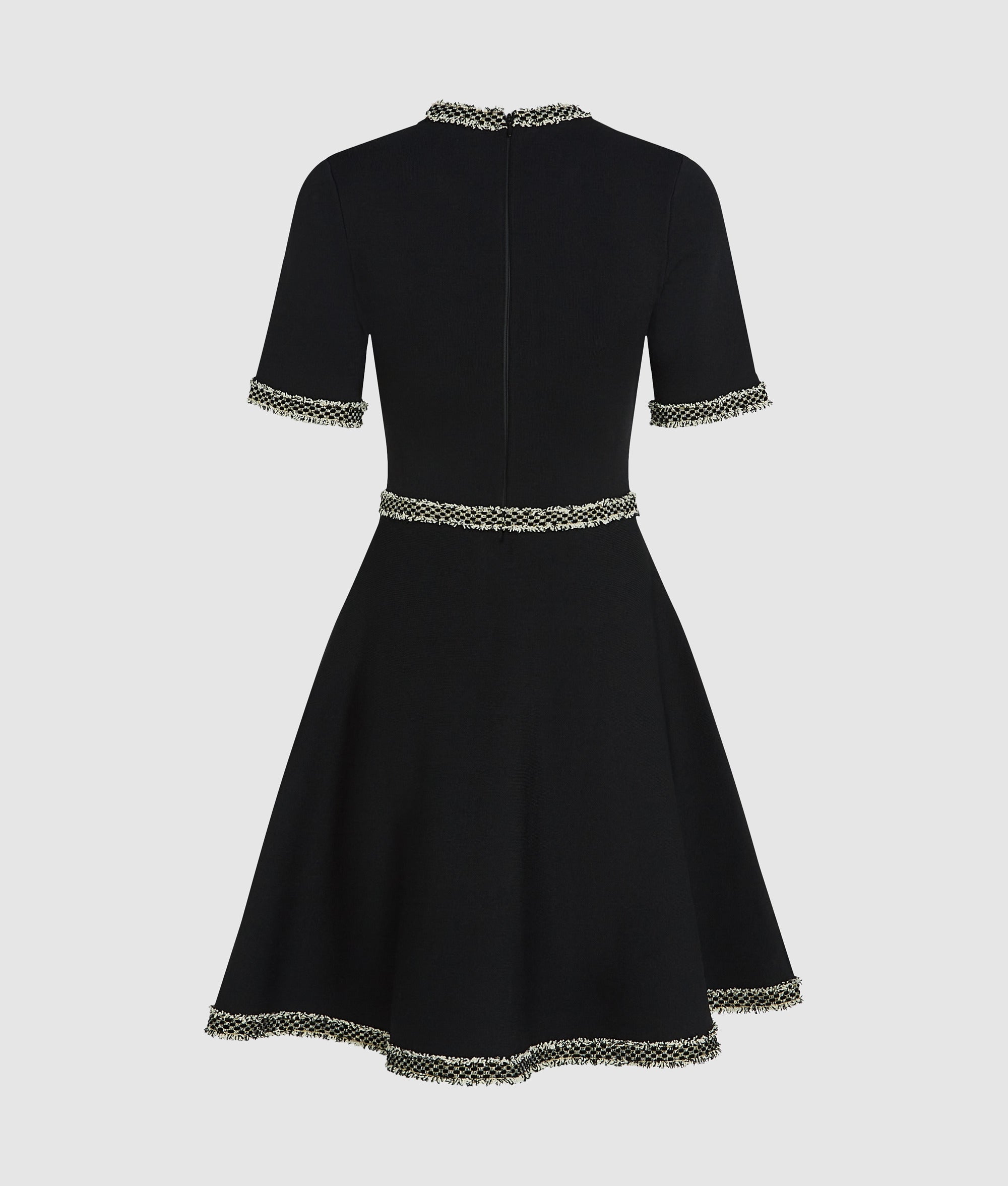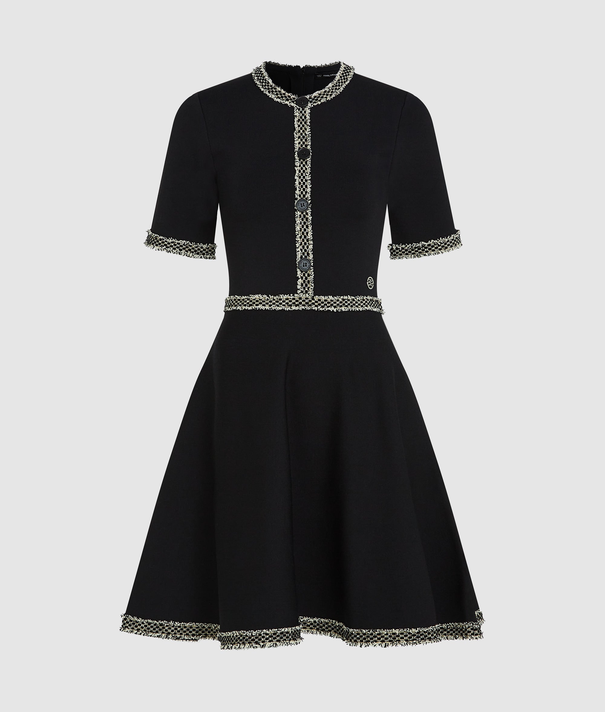 Undeniably chic. this midi dress flatters with a polished fit-and-flare silhouette. Boucl?? accents bring texture and elegance. perfect for desk-to-dinner styling.?