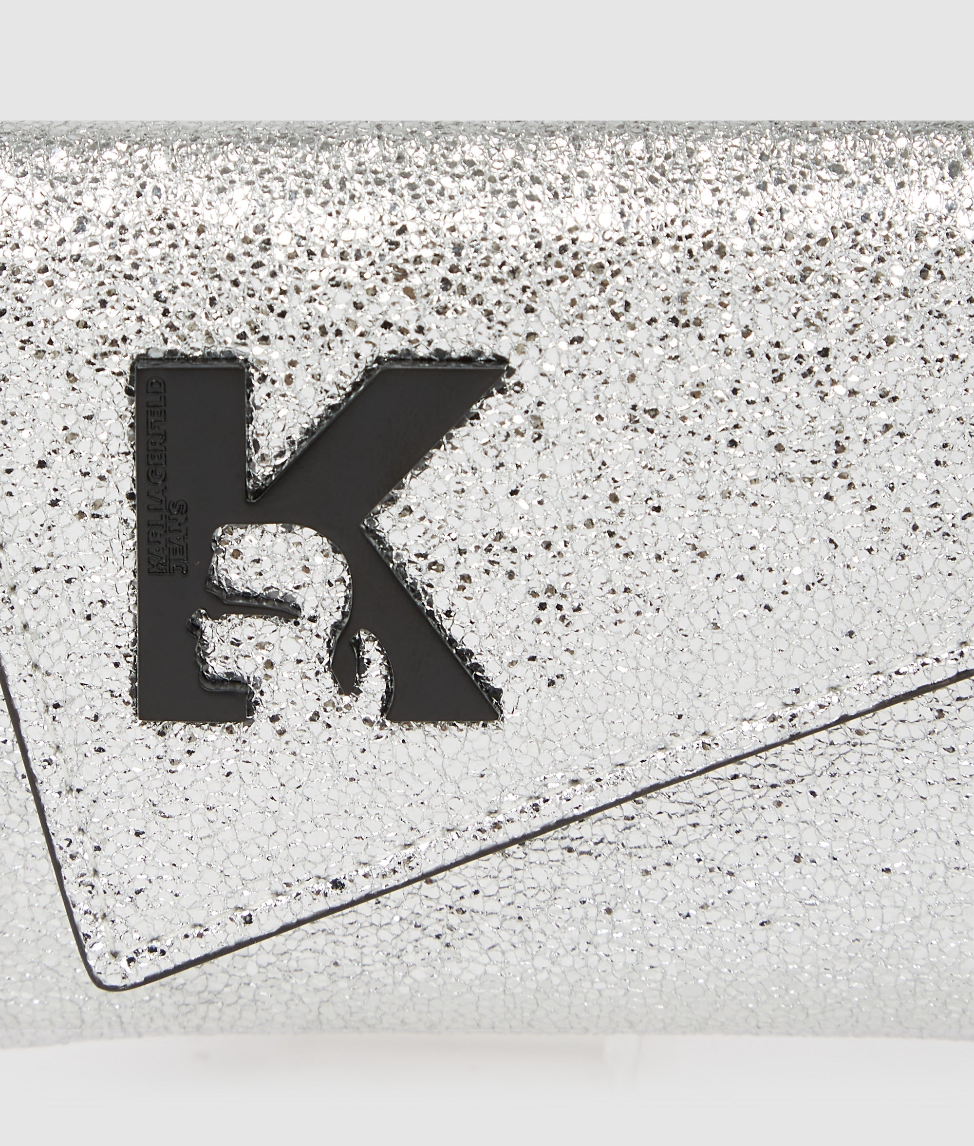 A contemporary asymmetric design. sleek sparkle finish and bold K-logo are at the center of this statement bifold wallet and keychain set. Packaged in a signature presentation box. they add a playful touch to your accessories collection.