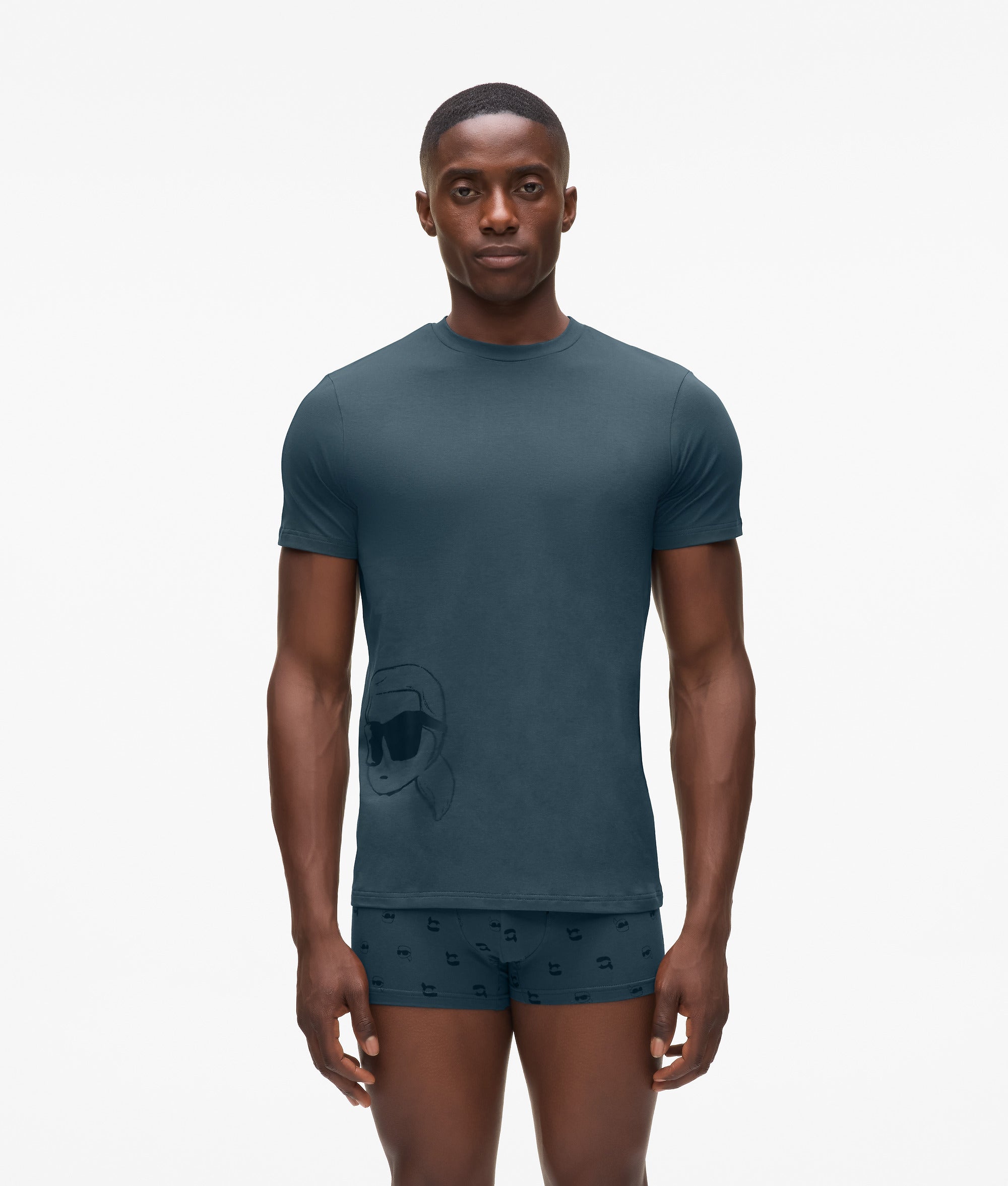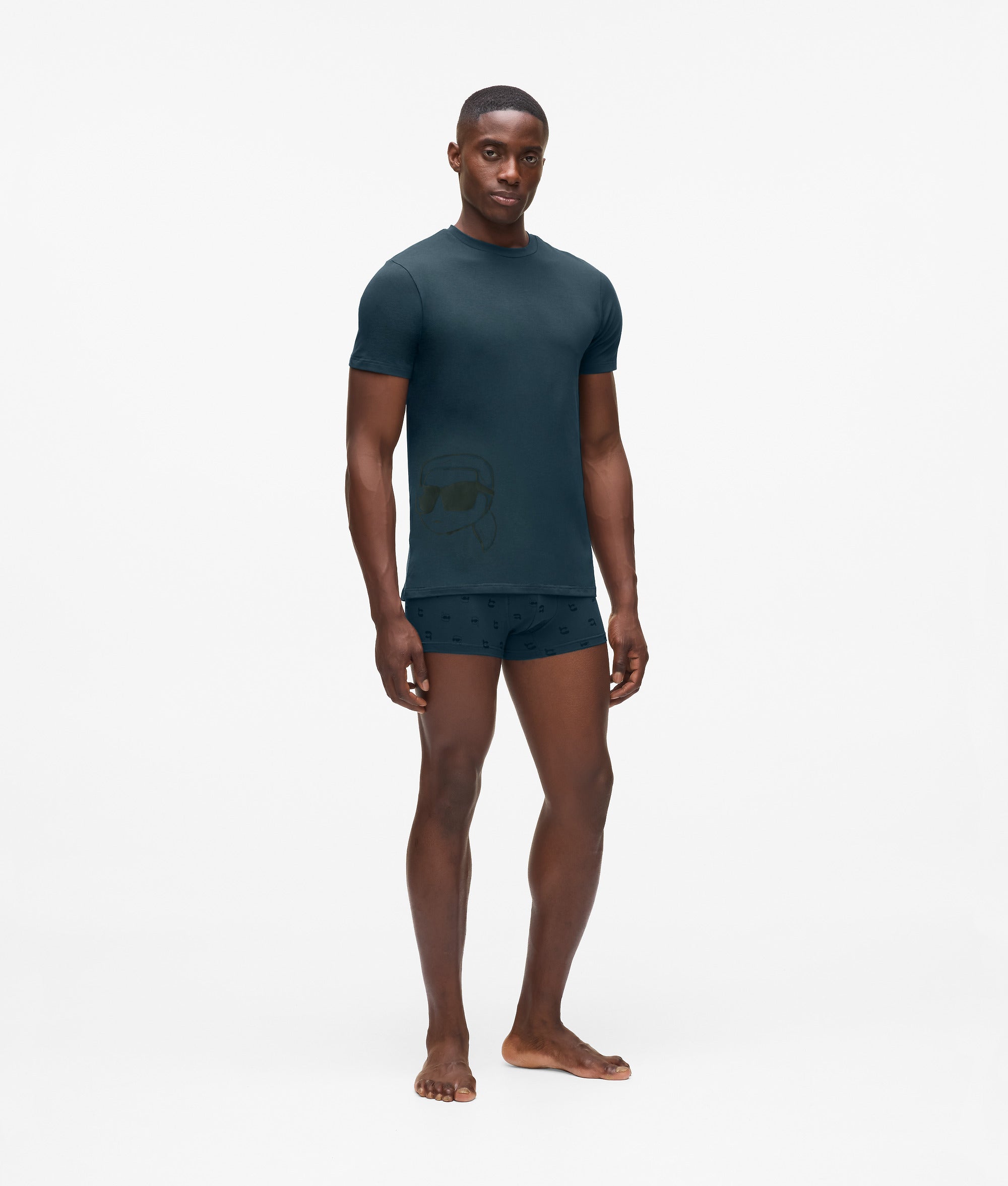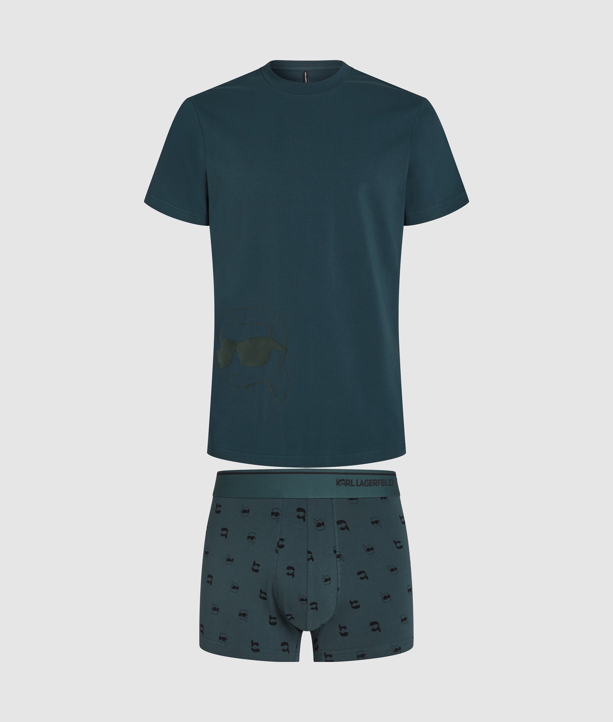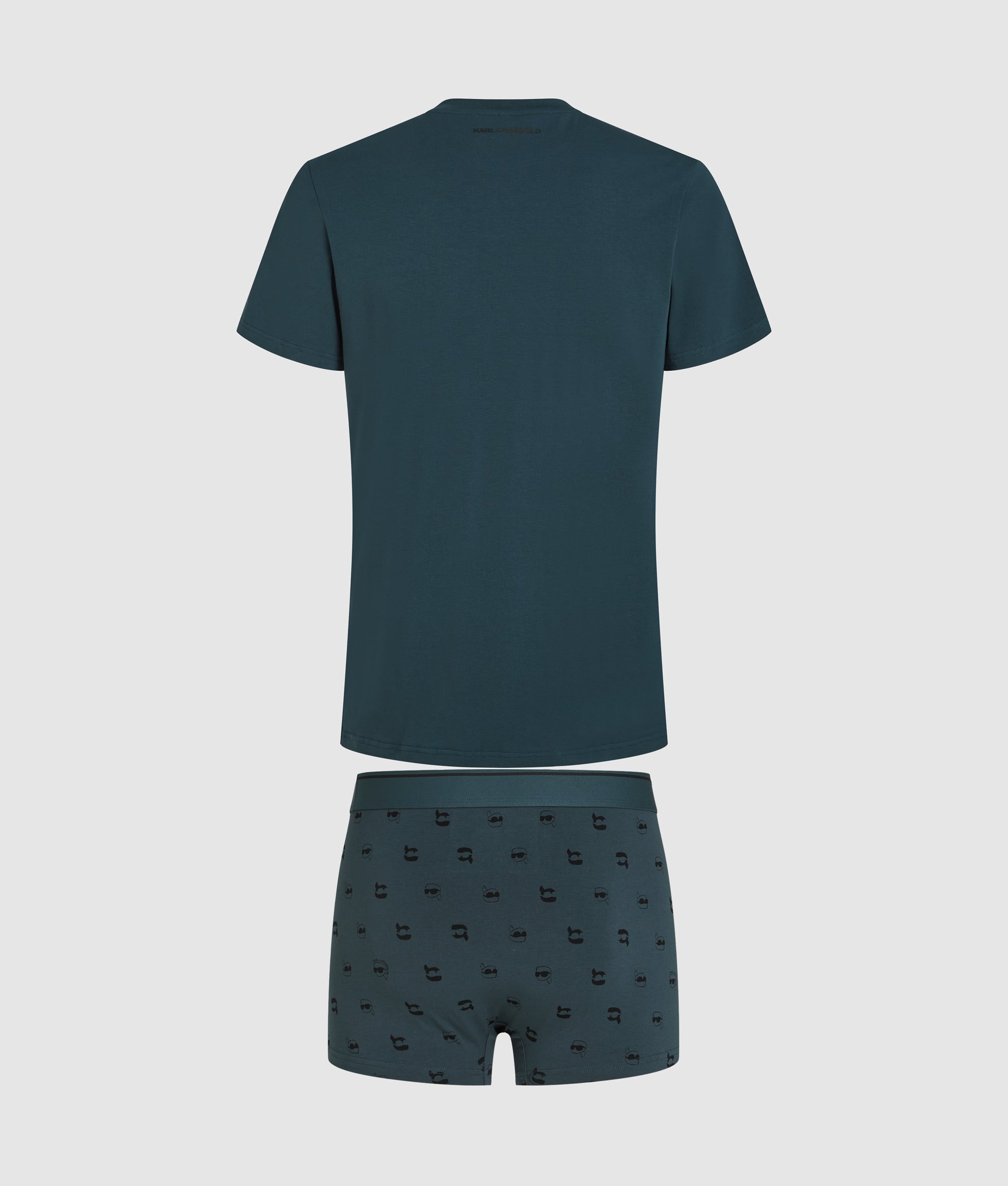 This pajama set delivers comfort with KARL attitude. The crew-neck T-shirt features bold Ikon artwork. while the matching trunks are topped with a branded waistband and all-over Ikon print.?