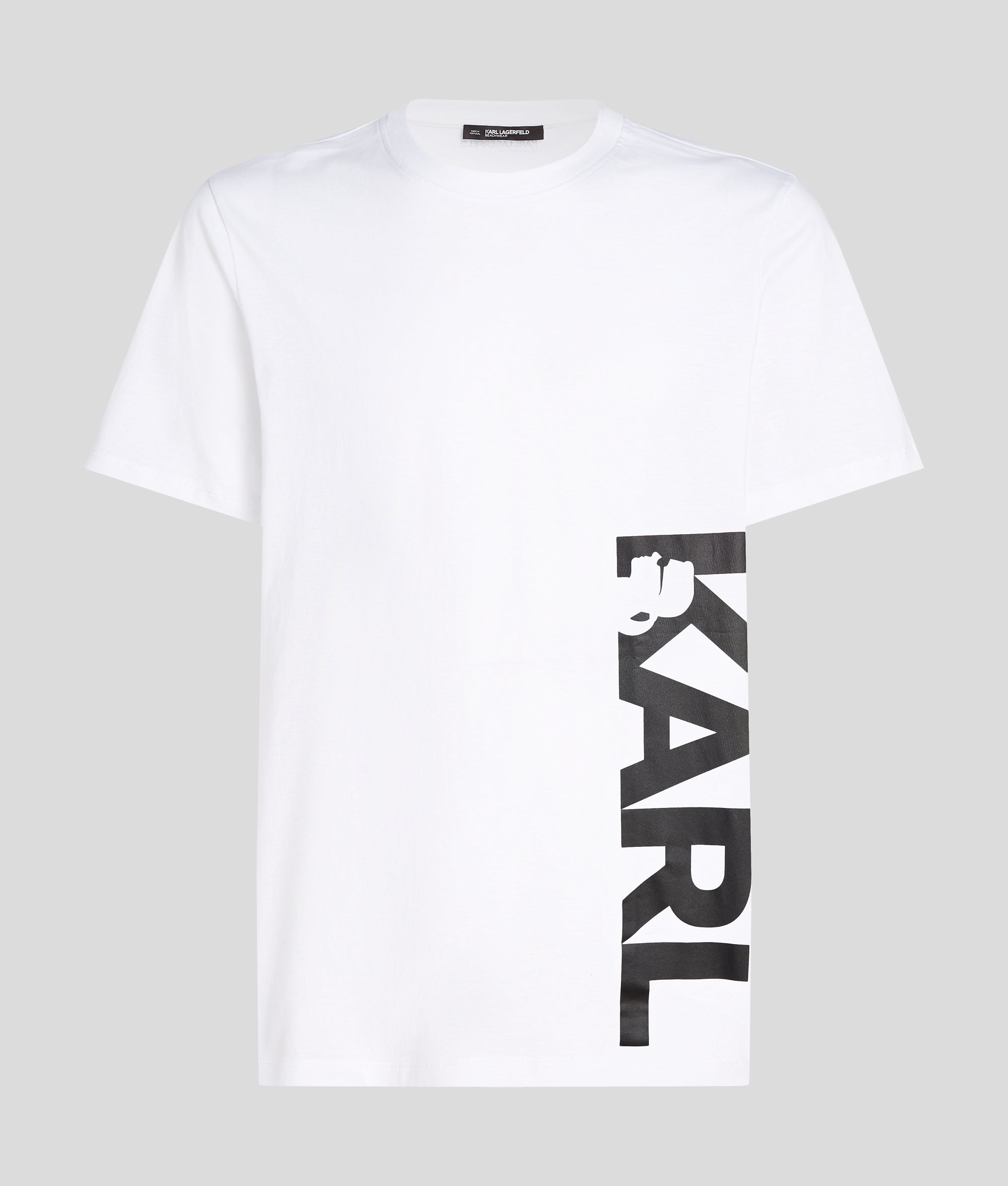 A perfect blend of comfort and style. this beachwear T-shirt features a ribbed crew neck and short sleeves. making it ideal for sunny days. The vertical KARL logo adds a distinctive touch. effortlessly elevating casual beach vibes.