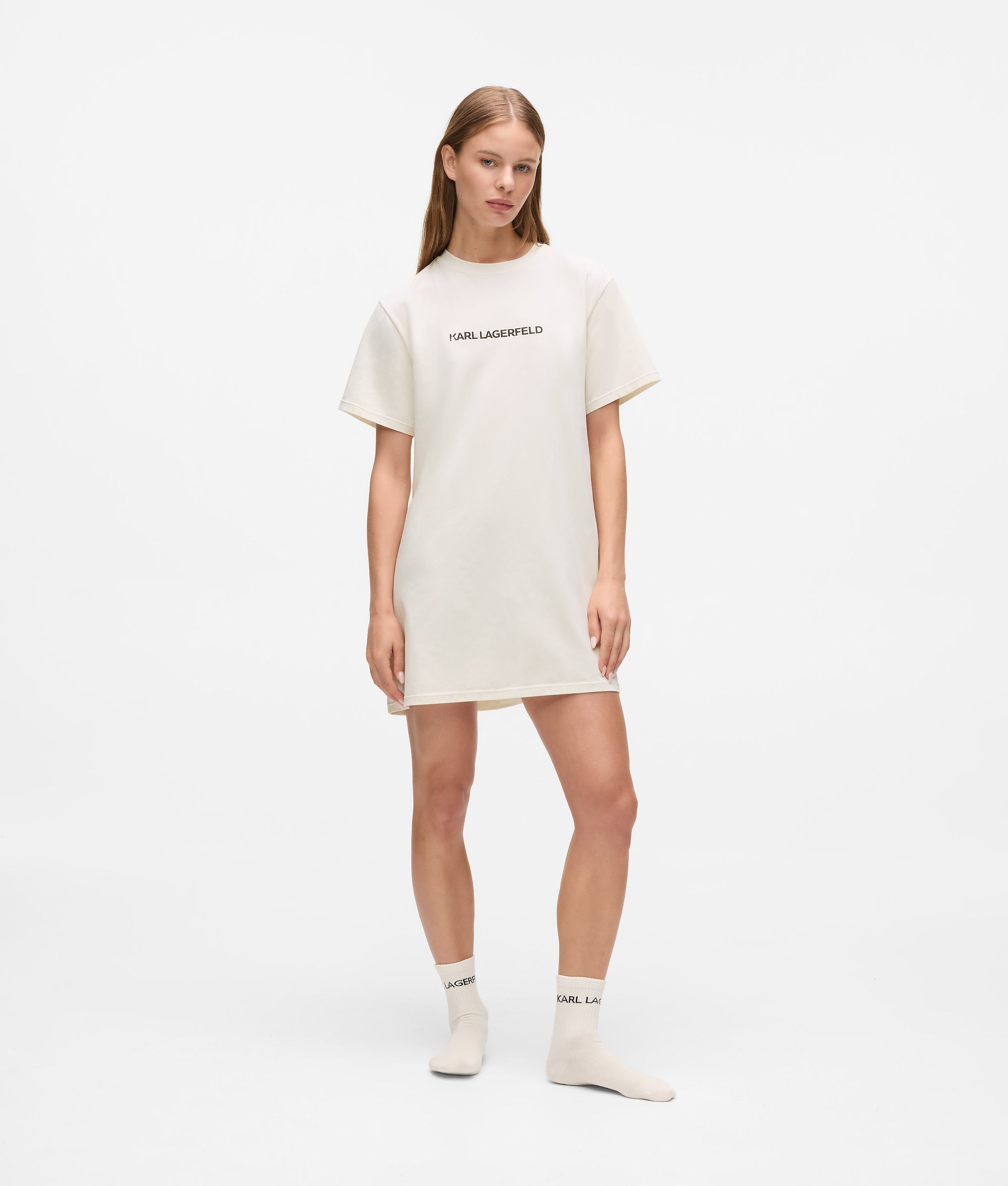 Chic. comfortable and ready to gift. This pajama set features a relaxed T-shirt dress and matching socks. both adorned with the unmistakable Karl Lagerfeld logo.?