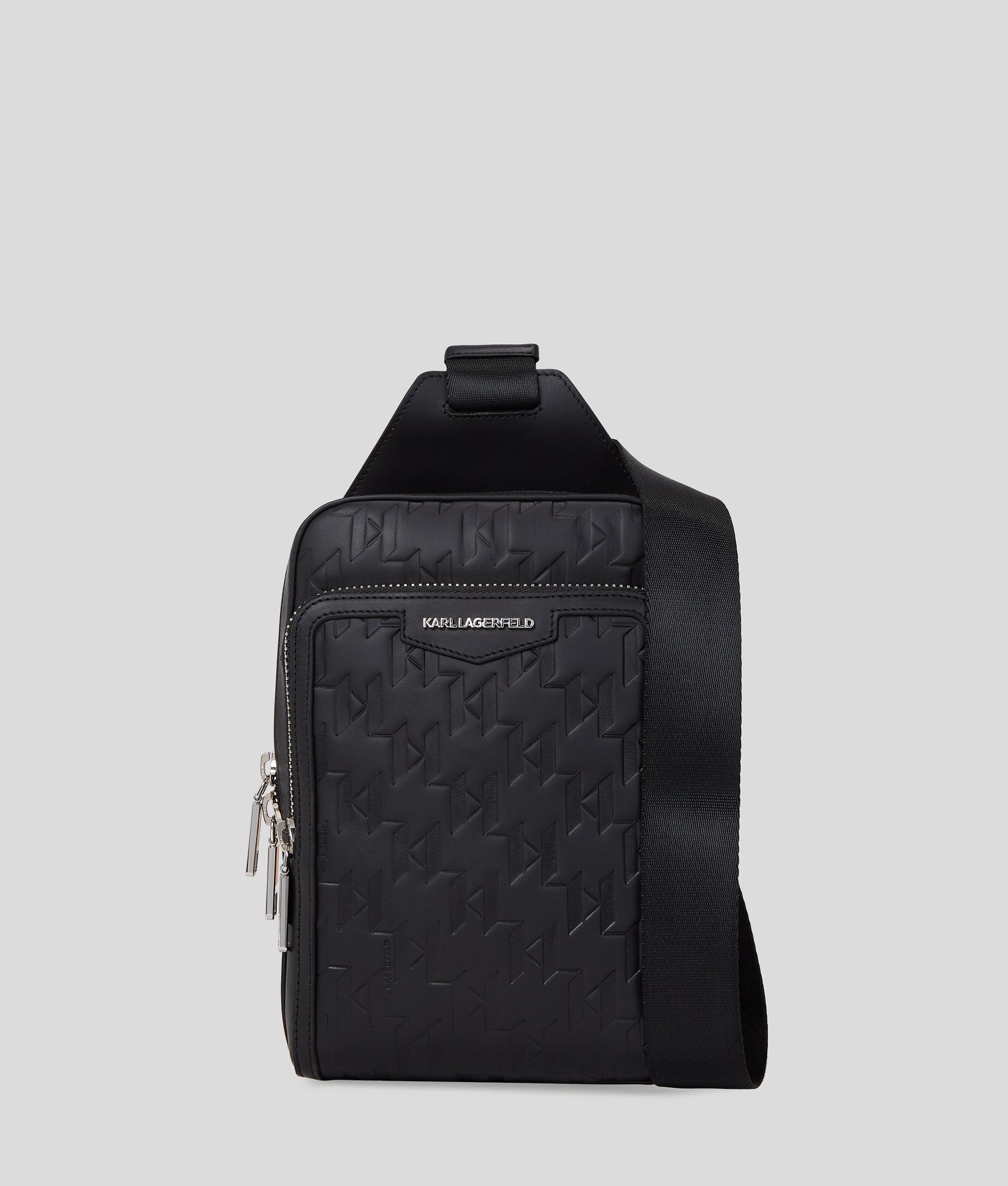 Modern practicality meets chic sophistication in the K/Loom sling bag. Made from luxurious leather. the contemporary silhouette features an all-over debossed KARL Monogram design at the front. polished metal hardware and an edgy webbing strap.