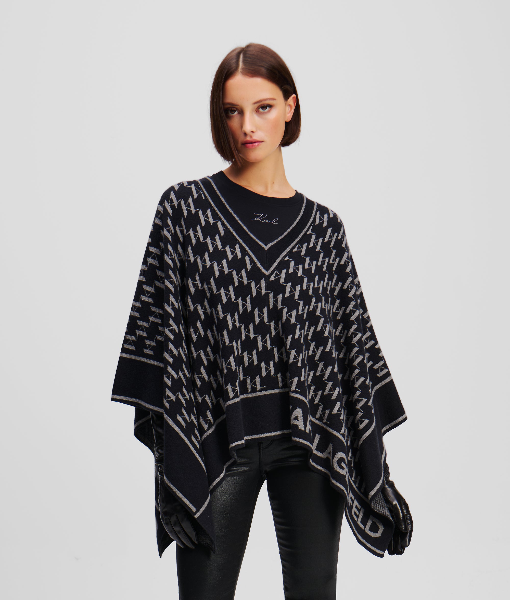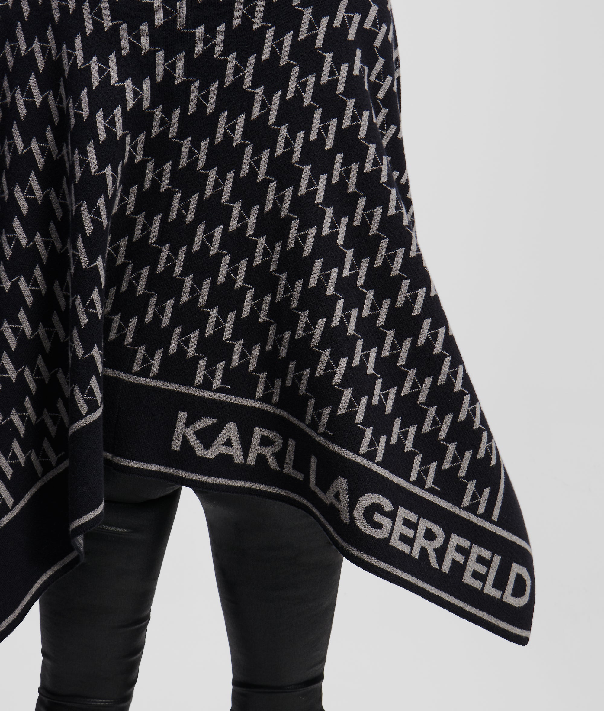 This cozy knitted cape features a V-neckline and a striking all-over KARL Monogram design. Bold KARL LAGERFELD detailing at the hem adds a statement touch.