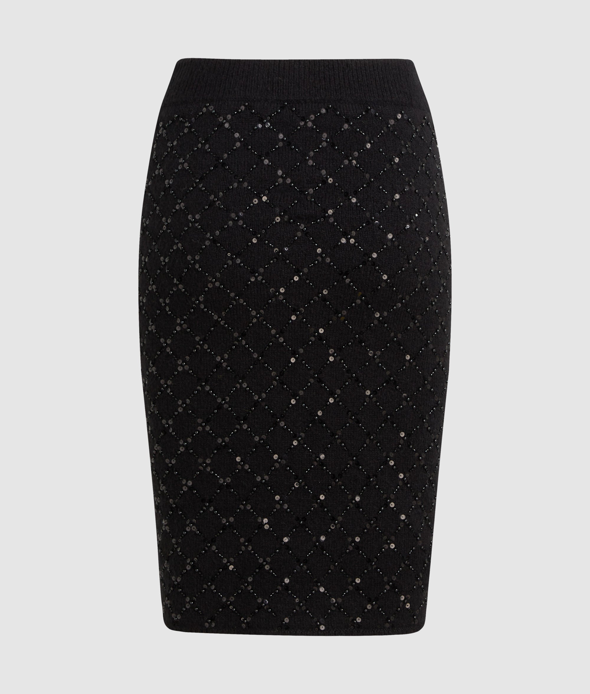 A classic silhouette. reimagined for the spotlight. This sleek. midi-length pencil skirt is embellished in dazzling sequins for glamour. texture. and impact. It’s your go-to piece for elevated evening elegance this party season.