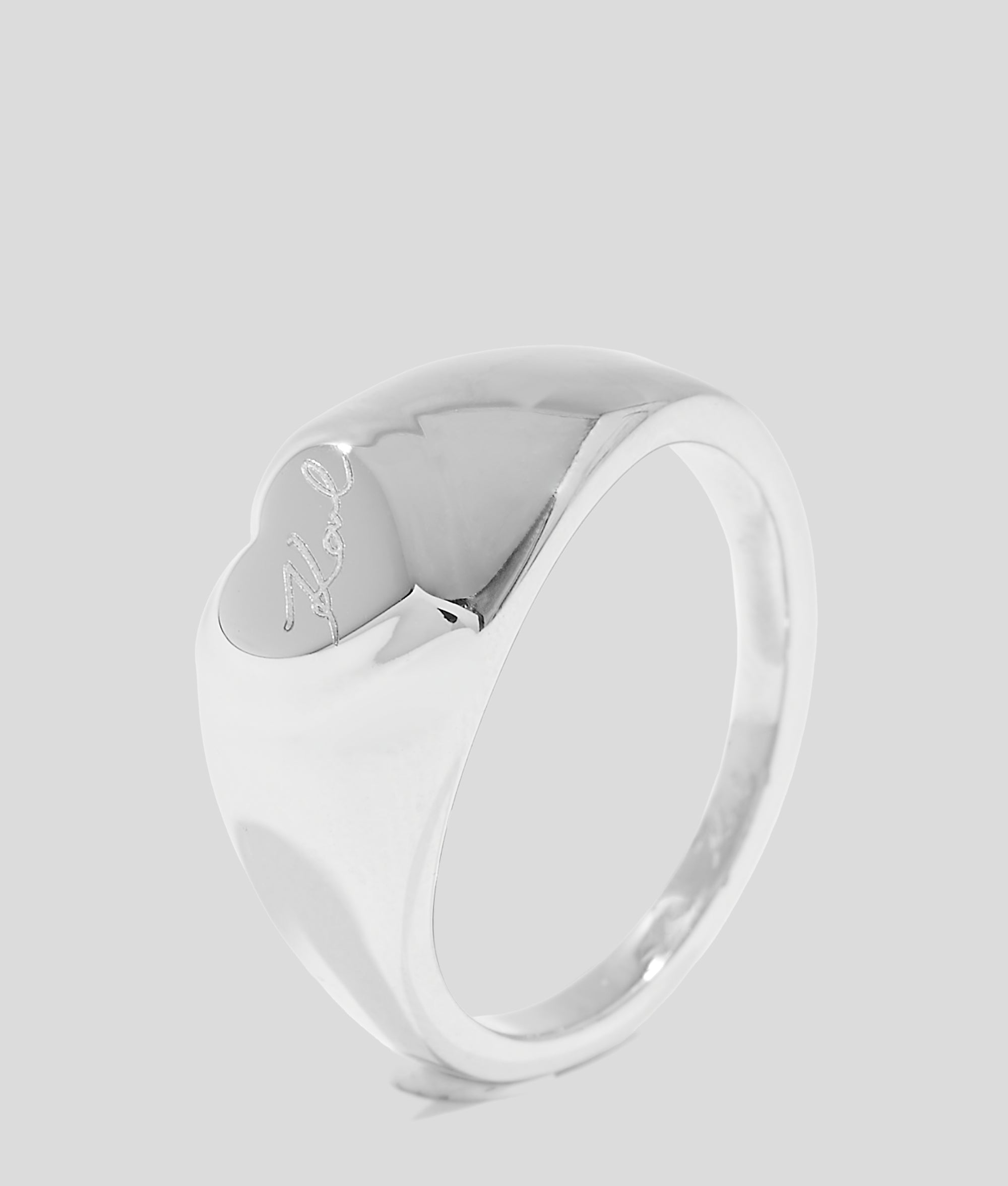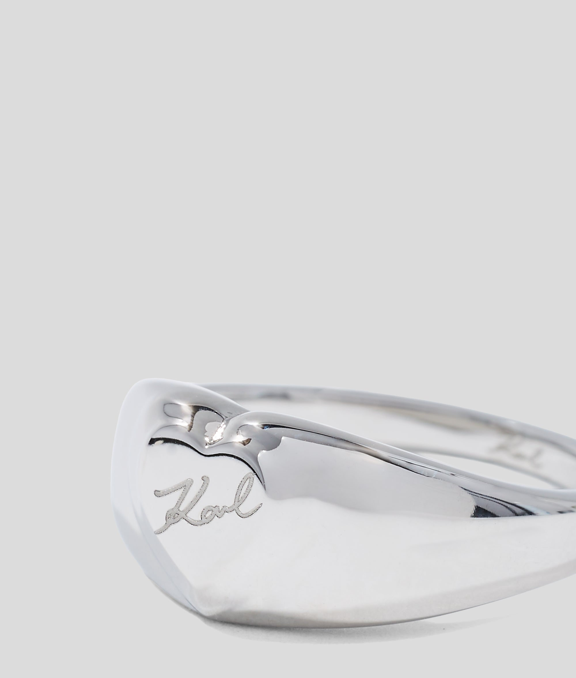 This polished silver signet ring features a debossed heart motif and the iconic KARL Signature logo. making a bold statement with its distinctive style.
