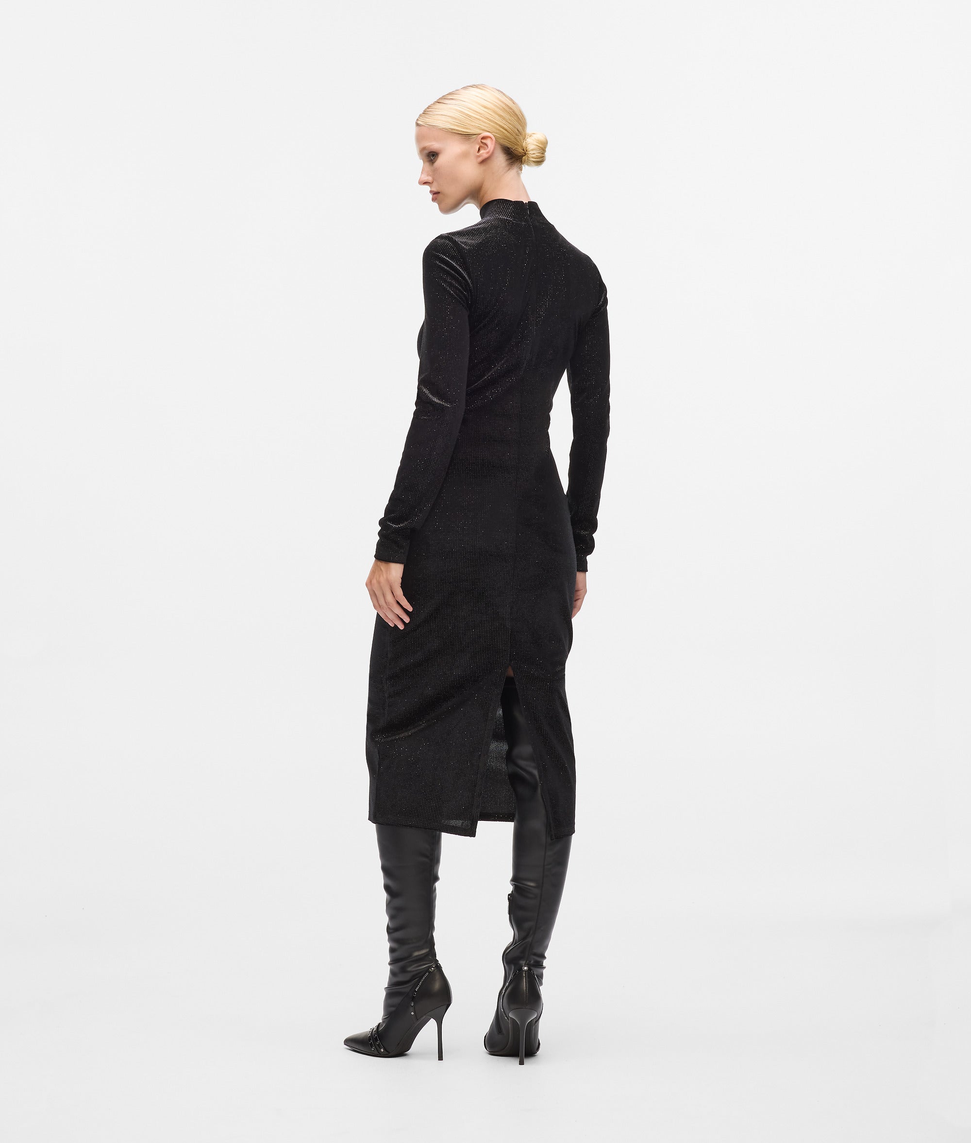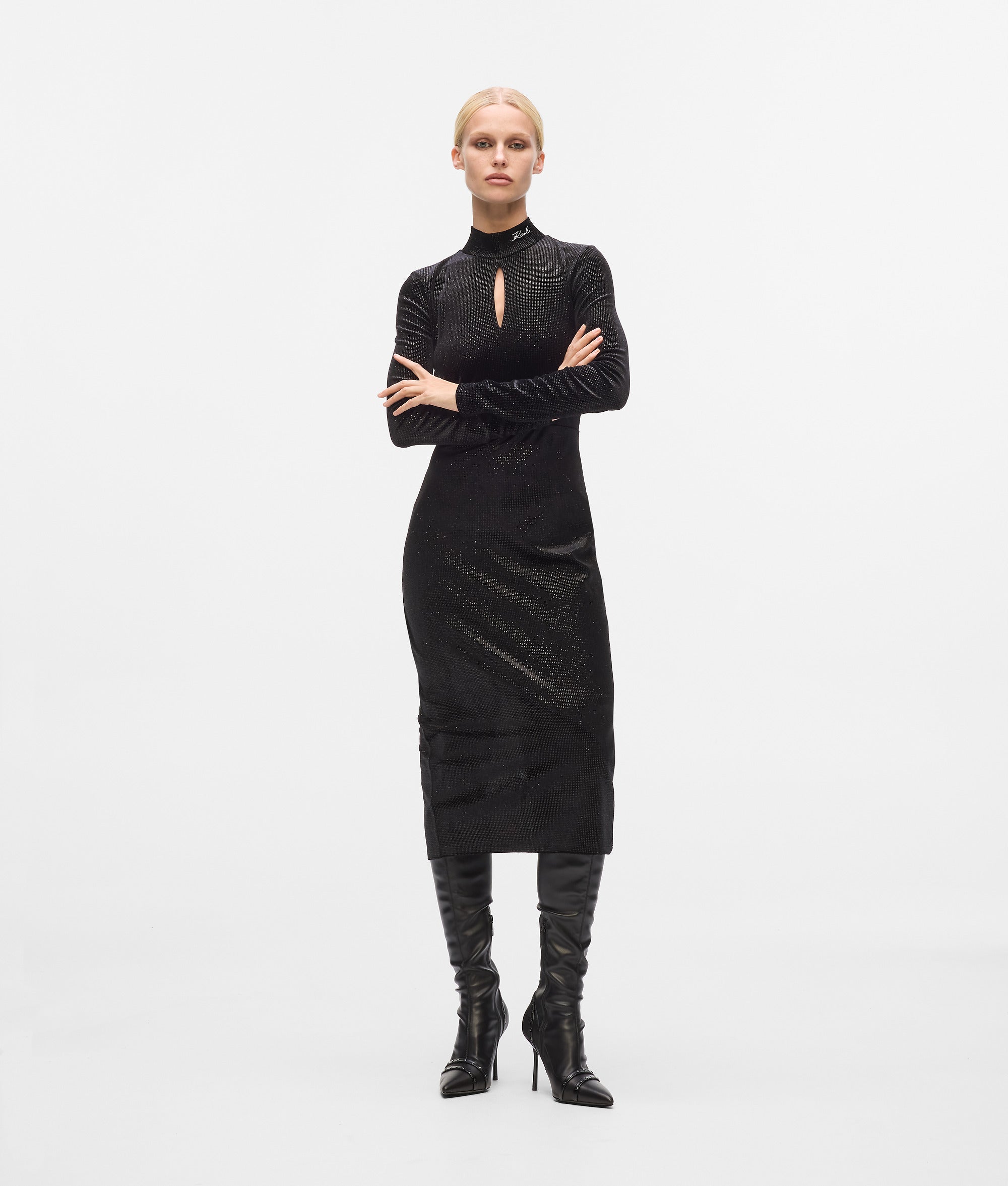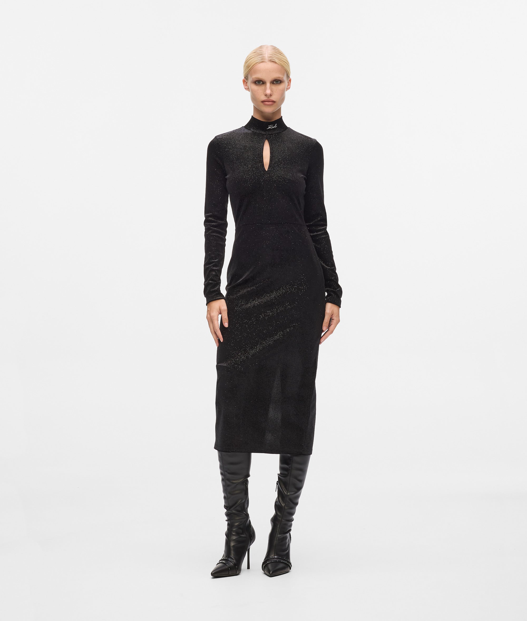 This shimmering velvet dress with a high neck and subtle logo embellishment captures effortless elegance. Sleek long sleeves and daring cut-outs add a bold. confident finish.